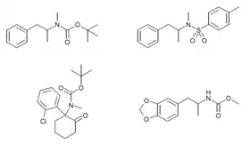 N-t-BOC-MDMA is a chemical compound which can be both a synthetic precursor to, or a prodrug of the empathogenic drug MDMA. It was first identified in Australia in 2015 as a seizure by customs, and has subsequently been found in China, Holland and other European countries. Originally it was thought to be intended as a non-illegal form of MDMA which could be easily converted into the prohibited final product after importation, however one seizure by police found N-t-BOC-MDMA in the process of being pressed into pills, and experiments with simulated gastic fluid confirmed that it can be broken down to MDMA by human stomach acid. Similar N-protected compounds such as N-t-BOC-methamphetamine, N-p-tosyl-methamphetamine, N-t-BOC-ketamine, N-t-BOC-norketamine and N-methoxycarbonyl-MDA have also been encountered by law enforcement.[1][2][3][4][5][6][7]