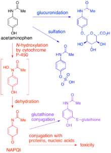 Acetaminophen (paracetamol) metabolism (click to enlarge). Pathways shown in blue and purple lead to non-toxic metabolites; the pathway in red leads to NAPQI, which is toxic if not conjugated to glutathione.
