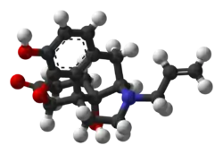 Naloxone, also known as N-allylnoroxymorphone or as 17-allyl-4,5α-epoxy-3,14-dihydroxymorphinan-6-one, is a synthetic morphinan derivative and was derived from oxymorphone (14-hydroxydihydromorphinone), an opioid analgesic.[55][56][57] Oxymorphone, in turn, was derived from morphine, an opioid analgesic and naturally occurring constituent of the opium poppy.[58] Naloxone is a racemic mixture of two enantiomers, (–)-naloxone (levonaloxone) and (+)-naloxone (dextronaloxone), only the former of which is active at opioid receptors.[59][60] The drug is highly lipophilic, allowing it to rapidly penetrate the brain and to achieve a far greater brain to serum ratio than that of morphine.[55] Opioid antagonists related to naloxone include cyprodime, nalmefene, nalodeine, naloxol, and naltrexone.[61]