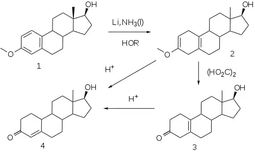 This reaction, now known as the Birch reduction,[51] is typified by the treatment of the monomethyl ether of estradiol (1) with a solution of lithium metal in liquid ammonia in the presence of alcohol as a proton source. Initial reaction constituents of 1,4-dimetalation of the most electron deficient positions of the aromatic ring–in the case of an estrogen, the 1 and 4-positions. Rxn of the intermediate with the proton source leads to a dihydrobenzene; a special virtue of this sequence in steroids is the fact that the double bind at 2 is in effect becomes an enol ether moiety. Treatment of this product (2) with weak acid, oxalic acid for e.g., leads to the hydrolysis of the enol ether, producing β,γ-unconjugated ketone 3. Hydrolysis under more strenuous conditions (mineral acids) results in migration/conjugation of the olefin to yield nandrolone (4).
