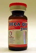 Nandrolone, also known as 19-nortestosterone, is an androgen and anabolic steroid (AAS) which is used in the form of esters such as nandrolone decanoate (brand name Deca-Durabolin) and nandrolone phenylpropionate (brand name Durabolin).[2][11][8][12] Nandrolone esters are used in the treatment of anemias, cachexia (wasting syndrome), osteoporosis, breast cancer, and for other indications.[8] They are not used by mouth and instead are given by injection into muscle or fat.[8][12][13]