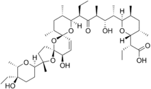 Narasin is a coccidiostat and antibacterial agent.[1][2] It is a derivative of salinomycin with an additional methyl group. Narasin is produced by fermentation of a strain of Streptomyces aureofaciens.[3]