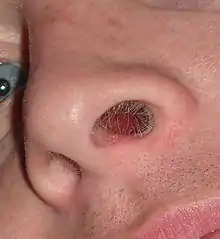 Nasal hair or nose hair, is the hair in the human nose. Adult humans have hair in the nostrils. Nasal hair functions include filtering foreign particles from entering the nasal cavity, and collecting moisture.[1] In support of the first function, the results of a 2010 study indicated that increased nasal hair density decreases the development of asthma in those who have seasonal rhinitis, possibly due to an increased capacity of the hair in the nostrils to filter out pollen and other allergens.[2]
