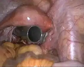 ![]() Endoscopic surgery trocar inserted through the vaginal fornix. The uterus is visible directly above the trocar. | |