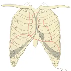 ![]() Protection on the rib cage of the heart, lungs and diaphragm. The shaded areas indicate the extent of the pleural cavities not filled by the lungs. | |