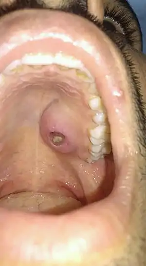 The condition most commonly is located at the junction of the hard and soft palate.[1] However, the condition may arise anywhere minor salivary glands are located.[nb 1] It has also been occasionally reported to involve the major salivary glands.[2][3] It may be present only on one side, or both sides.[1] The lesion typically is 1–4 cm in diameter.[4]