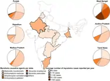 Mycetoma is an infection under the skin which in India may have either a fungus or a bacteria as cause.[42] In Rajasthan the cause is usually a fungus, but elsewhere in India a bacteria usually causes the disease.[42]