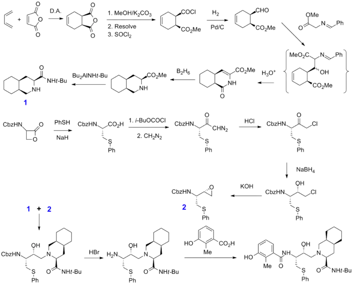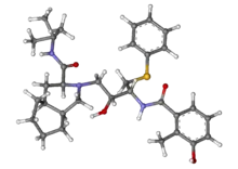 Nelfinavir is a protease inhibitor: it inhibits HIV-1 and HIV-2 proteases. HIV protease is an aspartate protease which splits viral protein molecules into smaller fragments, and it is vital to both the replication of the virus within the cell, and also to the release of mature viral particles from an infected cell. Nelfinavir is a competitive inhibitor[4] (2 nM) which is designed to bind tightly and is not cleaved due to the presence of a hydroxyl group as opposed to a keto group in the middle amino acid residue mimic, which would be otherwise S-phenylcysteine. All protease inhibitors bind to the protease, the precise mode of binding determines how the molecule inhibits the protease. The way Nelfinavir binds the enzyme may be sufficiently unique to reduce cross-resistance between it and other PIs. Also, not all PIs inhibit both HIV-1 and HIV-2 proteases.