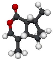 Nepetalactone is a name for multiple iridoid analog stereoisomers. Nepetalactones are produced by Nepeta cataria (catnip) and a many other plants belonging to the genus Nepeta, in which they protect these plants from herbivorous insects by functioning as insect repellents. They are also produced by many aphids, in which they are sex pheromones.[1] Nepetalactones are cat attractants, and cause the behavioral effects that catnip induces in domestic cats. However, they affect visibly only about 2/3 of adult cats. They produce similar behavioral effects in many other Felidae, especially in lions and jaguars.[2] McElvain and colleagues were the first to extract and name nepetalactones, which they did in 1941.[3][4]