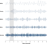 Five frequency bands of neural oscillation, as seen in ten seconds of EEG.