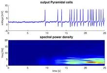 Simulation of a neural mass model showing network spiking during the onset of a seizure.[37] As the gain A is increased the network starts to oscillate at 3Hz.