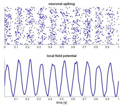 Simulation of neural oscillations at 10 Hz. Upper panel shows spiking of individual neurons (with each dot representing an individual action potential within the population of neurons), and the lower panel the local field potential reflecting their summed activity. Figure illustrates how synchronized patterns of action potentials may result in macroscopic oscillations that can be measured outside the scalp.