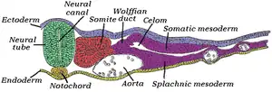 ![]() Transverse section of half of a chick embryo of forty-five hours' incubation. The dorsal (back) surface of the embryo is toward the top of this page, while the ventral (front) surface is toward the bottom. (Neural tube is in green.) | |