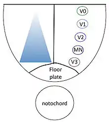 Three main ventral cell types are established during early neural tube development: the floor plate cells, which form at the ventral midline during the neural fold stage; as well as the more dorsally located motor neurons and interneurons.[2] These cell types are specified by the secretion of the Shh from the notochord (located ventrally to the neural tube), and later from the floor plate cells.[5] Shh acts as a morphogen, meaning that it acts in a concentration-dependent manner to specify cell types as it moves further from its source.[6]