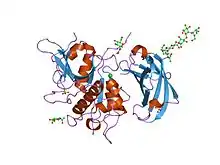 Galactosialidosis is caused by a mutation in the CTSA gene. This gene encodes the enzyme cathepsin A,[6] which forms a protein complex with neuraminidase-1 and beta-galactosidase to break down fats, sugars, and proteins ingested by lysosomes.[4] Cathepsin A is required in this process because within the complex, it prevents neuraminidase-1 and beta-galactosidase from breaking down prematurely, so that they may perform their functions properly. When the CTSA gene is mutated, the protein structure of cathepsin A is defected, making it incapable of binding to other proteins or form complexes. This leads to a deficiency of beta-galactosidase (GLB1) and neuraminidase-1 (NEU1).[7] As a result, the lysosome is unable to break down toxic substances and waste builds up within the cell.