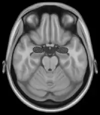 The basal ganglia are a group of nuclei which are located in the medial temporal lobe, above the thalamus and connected to the cerebral cortex. Specifically, the basal ganglia includes the subthalamic nucleus, substantia nigra, the globus pallidus, the ventral striatum and the dorsal striatum, which consists of the putamen and the caudate nucleus.[8] The basic functions of these nuclei deal with cognition, learning, and motor control and activities. The basal ganglia are also associated with learning, memory, and unconscious memory processes, such as motor skills and implicit memory.[4] Particularly, one division within the ventral striatum, the nucleus accumbens core, is involved in the consolidation, retrieval and reconsolidation of drug memory.[9]