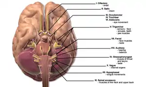 Abnormalities of the cranial nerves are present in 50–70 percent of cases. The most common abnormality is involvement of the facial nerve, which may lead to reduced power on one or both sides of the face (65 percent resp 35 percent of all cranial nerve cases), followed by reduction in visual perception due to optic nerve involvement. Rarer symptoms are double vision (oculomotor nerve, trochlear nerve or abducens nerve), decreased sensation of the face (trigeminal nerve), hearing loss or vertigo (vestibulocochlear nerve), swallowing problems (glossopharyngeal nerve) and weakness of the shoulder muscles (accessory nerve) or the tongue (hypoglossal nerve). Visual problems may also be the result of papilledema (swelling of the optic disc) due to obstruction by granulomas of the normal cerebrospinal fluid (CSF) circulation.[1]