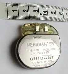 Implantable pacemakers were proposed for the first time in 1959 and became more sophisticated since then. The therapeutic application of pacemakers consists of numerous rhythm disturbances including some forms of tachycardia (too fast a heart beat), heart failure, and even stroke. Early implantable pacemakers worked only a short time and needed periodic recharging by an inductive link. These implantable pacemakers needed a pulse generator to stimulate heart muscles with a certain rate in addition to electrodes.[25] Today, modern pulse generators are programmed non-invasively by sophisticated computerized machines using RF, obtaining information about the patient's and device's status by telemetry. Also they use a single hermetically sealed lithium iodide (LiI) cell as the battery. The pacemaker circuitry includes sense amplifiers to detect the heart's intrinsic electrical signals, which are used to track heart activity, rate adaptive circuitry, which determine the need for increased or reduced pacing rate, a microprocessor, memory to store the parameters, telemetry control for communication protocol and power supplies to provide regulated voltage.[26]