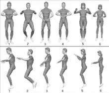 Later work by NASA based on research aboard Space Shuttle mission STS-57 found greater individual variations between crew members' neutral body positions than originally suggested by the earlier Skylab study.[4] In general, three main postures were exhibited by the crew as a whole. These constituted (1) an almost standing posture, (2) a slightly pitched forward posture with an extreme bend at the knees, and (3) an elongated posture with a straight neck. Differences in posture exhibited in this study could be a result of the athletic bearing of the participants or the type of exercise, or both, and the amount of exercise regularly performed. Other differences may also stem from past physical injuries such as bone breaks and knee or shoulder injuries, and from gender differences such as center of gravity.[4] No single crew member exhibited the typical NBP called out in the MSIS standard.[4]