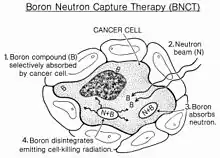 Neutron capture therapy (NCT) is a nonsurgical therapeutic modality for treating locally invasive malignant tumors such as primary brain tumors, recurrent head and neck cancer, and cutaneous and extracutaneous melanomas. It is a two-step procedure: first, the patient is injected with a tumor-localizing drug containing the non-radioactive isotope boron-10 (10B), which has a high propensity to capture thermal neutrons. The cross section of the 10B (3,837 barns) is many times greater than that of the other elements present in tissues such as hydrogen, oxygen, and nitrogen. In the second step, the patient is radiated with epithermal neutrons, the source of which is either a nuclear reactor or an accelerator. After losing energy as they penetrate tissue, the neutrons are captured by the 10B, which subsequently emits high-energy alpha particles that kill adjacent cells that have taken up sufficient quantities of 10B. All of the clinical experience to date with NCT is with the non-radioactive isotope boron-10, and this is known as boron neutron capture therapy (BNCT).[1] The use of other non-radioactive isotopes, such as gadolinium, has been limited to experimental studies and has not been used clinically. BNCT has been evaluated clinically as an alternative to conventional radiation therapy for the treatment of high-grade gliomas, meningiomas, and recurrent, locally advanced cancers of the head and neck region and superficial cutaneous and extracutaneous melanomas.[1][2]