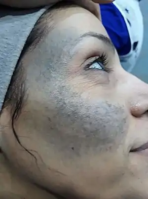 A Q-switched 1064 nm laser has been successfully used to treat the condition.[7][8] The Q-Switched Lasers (694 nm Ruby, 755 nm Alexandrite or 1064 nm Nd-YAG) with their high peak power and pulse width in nano second range are best suited to treat various epidermal, junctional, mixed and dermal lesions The Q-switched 1064 nm Nd-YAG is an ideal choice to treat dermal pigment as in nevus of Ota and in darker skin types, as it reduces the risk of epidermal injury and pigmentary alterations. The pigment clearance may be expected to be near total. Usually a number of treatment sessions with an interval of minimum six weeks are required to achieve total or near total clearance. The number of treatments depend mainly on the severity of the lesion. Darker the lesion, more are the treatments required. It also depends to some extent on the quality of the laser system used and its energy output. Last but not the least, experience of the laser surgeon plays a significant role in achieving early and good clearance.[9]