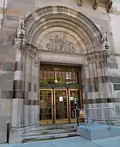 The building's exterior uses a combination of varieties of limestone and sandstone. The main entrance, at 103rd Street, uses a series columns with Romanesque caps, topped with statues of lions. The doors are ornate bronze with floral designs and small figures of Asclepius, god of medicine and physicians, and Hygieia, daughter of Asclepius and goddess of health. The two gods are also carved into the entranceway's tympanum, attended by dogs, symbolizing vigilance and keeping death and illness away.[6] The exterior also features many Latin inscriptions from notable authors, including Cicero, Hippocrates, Juvenal, Seneca the Younger, and Virgil. The first floor windows have exterior ornamental bronze grills, decorated in a Romanesque design. Those windows' lintels have figures of gods and fauna symbolic of medicine and additional Latin inscriptions.[6]