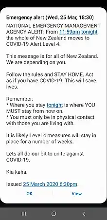 In response to rising cases, Prime Minister Jacinda Ardern closed the country's borders to non-citizens and non-residents on 19 March 2020.[4][5] On 21 March, the Government introduced a four-tier alert level system, which placed much of the country's population and economy into lockdown from 25 March.[6][7] Due to the success of the Government's elimination strategy in reducing the spread of COVID-19, lockdown restrictions on movement, social gatherings and economic activities were progressively eased on 28 April,[8] 11 May,[9] 25 May,[10] and 8 June.[11] The lifting of Alert Level 2 restrictions on 8 June eliminated social distancing and lockdown restrictions but retained border restrictions.[11] On 13 May, the Government passed the controversial COVID-19 Public Health Response Act 2020 which gives police and other "enforcement officers" the power to enter homes and other premises without a warrant in order to enforce lockdown restrictions.[12][13]