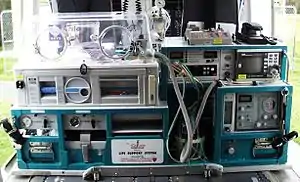 Newborn transport[1] is used to move premature and other sick infants from one hospital to another, such as a medical facility that has a neonatal intensive care unit and other services. Neonatal transport services such as NETS use mobile intensive care incubators fitted with mechanical ventilators, infusion pumps and physiological monitors capable of being used in a mobile environment.[2] These transport systems seek to emulate the environment of a neonatal intensive care and permit uninterrupted care to occur in a referring hospital and then during the journey by road or air ambulance. Power and medical gas supplies are carried within the system as well as making use of external supplies; as available. Infant transport systems commonly weigh over 100 kg and present a challenge to vehicle operators in terms of weight, manual handling, crashworthiness and power consumption.