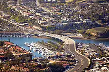 Newport Bay is divided by the Pacific Coast Highway bridge, which is too low for most sailboats and very large boats to pass under. North of the bridge is referred to as Upper Newport Bay, or the Back Bay. South of the bridge is commonly called Lower Newport Bay, or Newport Harbor. However the Back Bay also has harbor facilities, especially the marina and launch ramp at Newport Dunes Marina.[16]
