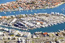 The north end of the Newport Harbor channels around Lido Island have a number of small business centers and were at one time used by the fishing fleets as their home. On the North East side of the channel, the Lido Marina Village now provides the local port to many "Newport Party Boats" as well as small merchants and local restaurants. It also hosts the area boat show each year as well as an organic "Farmers Market"[17] Sundays, in addition to being the port for the local Gondola Company.[18] In 2014, the center was closed for a renovation.[19] The Lido Village was reopened in 2017 after a complete renovation.[20]