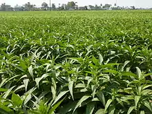 Nicotiana rustica, commonly known as Aztec tobacco[2] or strong tobacco,[3] is a rainforest plant in the family Solanaceae. It is a very potent variety of tobacco, containing up to nine times more nicotine than common species of Nicotiana such as Nicotiana tabacum (common tobacco).[4] More specifically, N. rustica leaves have a nicotine content as high as 9%, whereas N. tabacum leaves contain about 1 to 3%.[5] The high concentration of nicotine in its leaves makes it useful for producing pesticides, and it has a wide variety of uses specific to cultures around the world. However, N. rustica is no longer cultivated in its native North America, as N. tabacum has replaced it.[6]