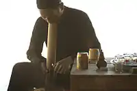Nicotiana rustica is called mapacho in South America. It is often used for entheogenic purposes by South American shamans,[7] because of its high nicotine content and comparatively high levels of beta-carbolines, including the harmala alkaloids harmane and norharmane.[8] There are many methods of administration in South American ethnobotanical preparations. In a preparation known as singado or singa, N. rustica is allowed to soak or be infused in water, and the water is then insufflated into the stomach. The plant is also smoked in cigars, used in enemas, and made into a lickable product known as ambil. Finally, N. rustica is a common ingredient in rapé, a smokeless tobacco product usually used as a nasal snuff. Rapé is often a combination of N. rustica and a host of other herbs, depending on the intended use, including tonka beans, cinnamon, clove buds, alkaline ashes[4] (creating nu-nu), Anadenanthera, Erythroxylum, Virola, and more.[9]
