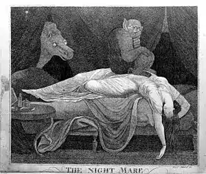 Nightmare disorders are included in the parasomnias, which cover all the unusual behaviours during sleep.[2] Nightmare disorders can be confused with sleep terror disorders.[3] The difference is that after a sleep terror episode, the patient wakes up with more dramatic symptom than for a nightmare disorder, such as screaming and crying.[3] Furthermore, they don't remember the reason of the fear, while a patient with a nightmare disorder remembers every detail of the dream.[3] Finally, the sleep terrors usually occur during NREM Sleep.[4][5]