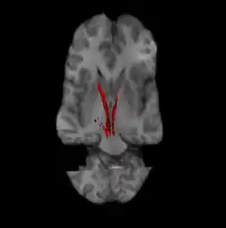 The nigrostriatal pathway is a bilateral dopaminergic pathway in the brain that connects the substantia nigra pars compacta (SNc) in the midbrain with the dorsal striatum (i.e., the caudate nucleus and putamen) in the forebrain. It is one of the four major dopamine pathways in the brain, and is critical in the production of movement as part of a system called the basal ganglia motor loop. Dopaminergic neurons of this pathway release dopamine from axon terminals that synapse onto GABAergic medium spiny neurons (MSNs), also known as spiny projection neurons (SPNs),[1][2] located in the striatum.