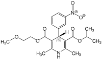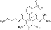 Nimodipine contains a stereocenter and can exist as either of two enantiomers. The pharmaceutical drug is a racemate, an equal mixture of the (R)- and (S)- forms.[16]