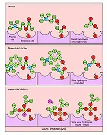 Chronic exposure to high level of nitrogen dioxide results in the allosteric inhibition of glutathione peroxidase and glutathione S-transferase, both of which are important enzymes found in the mucous membrane antioxidant defense system, that catalyse nucleophilic attack by reduced glutathione (GSH) on non-polar compounds that contain an electrophillic carbon and nitrogen. These inhibition mechanisms generates free radicals that causes peroxidation from the lipids in the mucous membrane leading to increased peroxidized erythrocyte lipids, a reaction that proceeds by a free radical chain reaction mechanism that result in oxidative stress.[42] The oxidative stress on the mucous membrane causes the dissociation of the GSTp-JNK complex, oligomerization of GSTP and induction of the JNK pathway, resulting in apoptosis or inflammation of the bronchioles and pulmonary alveolus in mild cases.[43] On migrating to the bloodstream, nitrogen dioxide poisoning results in an irreversible inhibition of the erythrocite membrane acetylcholinesterase which may lead to muscular paralysis, convulsions, bronchoconstriction, the narrowing of the airways in the lungs (bronchi and bronchioles) and death by asphyxiation.[44][45][46] It also causes a decrease in glucose-6-phosphate dehydrogenase which may results in glucose-6-phosphate dehydrogenase deficiency known as favism, a condition that predisposes to hemolysis (spontaneous destruction of red blood cells).[47] Acute and chronic exposure also reduces glutathione reductase, an enzyme that catalyzes the reduction of glutathione disulfide (GSSG) to the sulfhydryl form glutathione (GSH), which is a critical molecule in resisting oxidative stress and maintaining the reducing environment of the cell.[48][49][50]