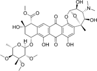 Nogalamycin is an anthracycline antibiotic produced by the soil bacteria Streptomyces nogalater. It has antitumor properties but it is also highly cardiotoxic. The less cardiotoxic semisynthetic analog menogaril was developed in the 1970s. Currently nogalamycin and menogaril are not used clinically.[1]