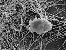 Neutrophils are some of the first immune cells to travel to sites of infection that aid in fighting infection by ingesting microorganisms and providing the enzymes to kill them. This process characterizes neutrophils as a type of phagocyte.[8] Neutrophils contain neutrophil extracellular traps (NETs), composed of granule and nuclear constituents, which play a role in breaking up and killing bacteria that has invaded the immune system. NETs, composed of activated neutrophils, are fragile structures consisting of smooth stretches and globular domains, as shown via high-resolution scanning electron microscopy.[9]