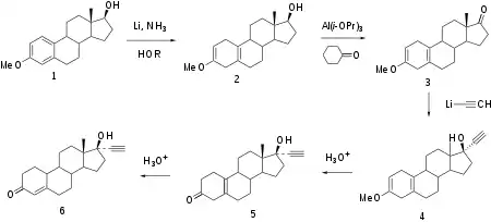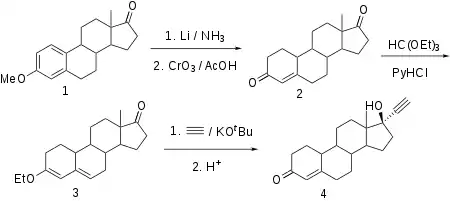 - Ueberwasser, H.; Heusler, K.; Kalvoda, J.; Meystre, C.; Wieland, P.; Anner, G.; Wettstein, A. (1963). "19-Norsteroide II. Ein einfaches Herstellungsverfahren für 19-Norandrostan-Derivate. über Steroide, 193. Mitteilung". Helvetica Chimica Acta. 46: 344–352. doi:10.1002/hlca.19630460135.
