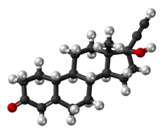 Norethisterone is weakly estrogenic (via conversion into its metabolite EE), and for this reason, it has been found at high dosages to be associated with high rates of estrogenic side effects such as breast enlargement in women and gynecomastia in men, but also with improvement of menopausal symptoms in postmenopausal women.[43] It has been suggested that very high dosages (e.g., 40 mg/day, which are sometimes used in clinical practice for various indications) of NETA (and by extension norethisterone) may result in an increased risk of venous thromboembolism (VTE) analogously to high dosages (above 50 μg/day) of EE, and that even doses of NETA of 10 to 20 mg, which correspond to EE doses of approximately 20 to 30 μg/day, may in certain women be associated with increased risk.[44][45] A study also found that ethinylestradiol and norethisterone had a greater influence on coagulation factors when the dose of norethisterone was 3 or 4 mg than when it was 1 mg.[46] This might have been due to additional ethinylestradiol generated by higher doses of norethisterone.[46]