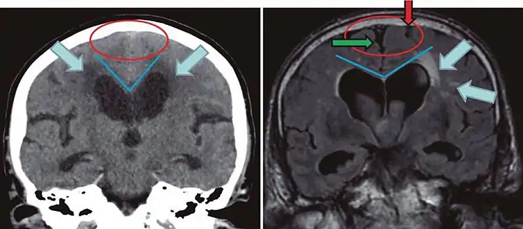 - Imaging from magnetic resonance imaging (MRI) or computed tomography (CT) is needed to demonstrate enlarged ventricles and no macroscopic obstruction to cerebrospinal fluid flow. Imaging should show an enlargement to at least one of the temporal horns of lateral ventricles, and impingement against the falx cerebri resulting in a callosal angle ≤ 90° on the coronal view, showing evidence of altered brain water content, or normal active flow (which is referred to as "flow void") at the cerebral aqueduct and fourth ventricle.
