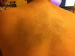 Notalgia paraesthetica (NP) or notalgia paresthetica (also known as "Hereditary localized pruritus", "Posterior pigmented pruritic patch", and "subscapular pruritus"[1]) is a chronic sensory neuropathy. Notalgia paraesthetica is a common localized itch, affecting mainly the area between the shoulder blades (especially the T2–T6 dermatomes) but occasionally with a more widespread distribution, involving the shoulders, back, and upper chest.[2]:402 The characteristic symptom is pruritus (itch or sensation that makes a person want to scratch) on the back, usually on the left hand side below the shoulder blade (mid to upper back). It is occasionally accompanied by pain, paresthesia (pins and needles), or hyperesthesia (unusual or pathologically increased sensitivity of the skin to sensory stimuli, such as pain, heat, cold, or touch), which results in a well circumscribed hyperpigmentation of a skin patch in the affected area.