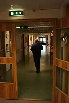 Assisted living residences or assisted living facilities (ALFs) are housing facilities primarily for elders and may also have services for people with disabilities.[35][36][37] These facilities provide supervision or assistance with activities of daily living (ADLs); ALFs are an eldercare alternative on the continuum of care for people, for whom independent living is not appropriate but who do not need the 24-hour medical care provided by a nursing home. Keren Brown Wilson first developed the idea for assisted living during the 1980s as an alternative to nursing home care.[38] Assisted living is a philosophy of care and services promoting independence and dignity which was promoted nationwide as a community support in the 1990s, not a new nursing facility movement. In the original conception of assisted living, Wilson sought to provide similar services to that of a nursing home, but still grant the resident more autonomy. In other words, medical personnel were on-site and available to residents, but residents were still free to dictate their schedules. For example, they could eat what they wanted, and sleep when they wanted to. Wilson's idea was to emphasize maintaining a consistent, satisfying quality of life for the resident. Wilson's idea was first tested as an experiment in Oregon, after which the idea spread, leading to more and more assisted living facilities across the nation during the 1990s. As other corporations developed more and more assisted living communities, the concept began to increasingly mimic nursing homes as opposed to the original assisted living model proposed by Wilson.[38] Thus, while assisted living facilities may now offer a menu of different services, they often remain tied to nursing facilities, policies and practices which were the original source of national concern. In addition, these facilities were funded often instead of in-home services and supports for individuals and families in local communities which has been requested nationwide for over three decades.[39] Similar to nursing homes, assisted living communities are typically home to senior citizens and individuals with dementia. These communities require certification by the state.[40]