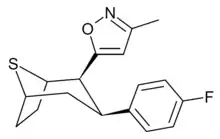 O-4210 is a drug developed by Organix Inc which acts as a selective dopamine reuptake inhibitor, with good selectivity over the serotonin transporter but its activity at the noradrenaline transporter is not known. It is a thiatropane derivative, related in chemical structure to phenyltropane derivatives such as RTI-126 and RTI-171, but with the amine nitrogen replaced by sulfur, demonstrating that this nitrogen only plays a minor contribution to receptor binding, in a similar manner to the related oxatropane tropoxane.[1][2]