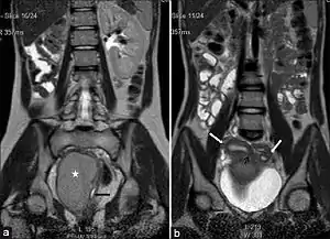 | (a) Coronal Single shot T2W image shows absence of the right kidney. The distended hemivagina (asterisk) is seen on the right side and the normal collapsed left hemivagina with minimal fluid is seen adjacent to it (black arrow). The distended hemivagina ends above the introitus and its contents are hypointense to fat. (b) Coronal Single shot T2W image shows right and left uterine horns (white arrows). The right uterine horn cavity is seen to communicate with the upper end of the fluid collection in right hemivagina (small black arrow) |