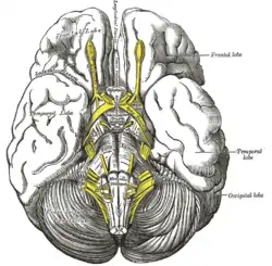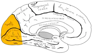 The occipital lobe is the visual processing center of the mammalian brain containing most of the anatomical region of the visual cortex.[1] The primary visual cortex is Brodmann area 17, commonly called V1 (visual one). Human V1 is located on the medial side of the occipital lobe within the calcarine sulcus; the full extent of V1 often continues onto the occipital pole. V1 is often also called striate cortex because it can be identified by a large stripe of myelin, the Stria of Gennari. Visually driven regions outside V1 are called extrastriate cortex. There are many extrastriate regions, and these are specialized for different visual tasks, such as visuospatial processing, color differentiation, and motion perception. Bilateral lesions of the occipital lobe can lead to cortical blindness (See Anton's syndrome).