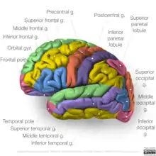 Lobes of the human brain (the occipital lobe is shown in red) | |
