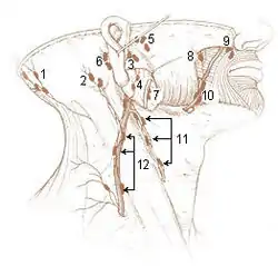 ![]() Superficial lymph glands and lymphatic vessels of head and neck. (Occipital glands labeled at center left.) | |