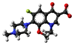 Ofloxacin is a broad-spectrum antibiotic that is active against both Gram-positive and Gram-negative bacteria. It functions by inhibiting two bacterial type II topoisomerases, DNA gyrase and topoisomerase IV.[54] Topo IV is an enzyme necessary to separate (mostly in prokaryotes, in bacteria in particular) replicated DNA, thereby inhibiting bacterial cell division.