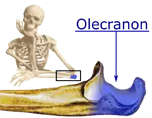 The olecranon is situated at the proximal end of the ulna, one of the two bones in the forearm.[1] When the hand faces forward (supination) the olecranon faces towards the back (posteriorly).